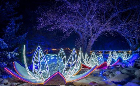 Evergreen Trees & Arboretum Greenhouses: Lush greenery contrasts beautifully with winter snow.