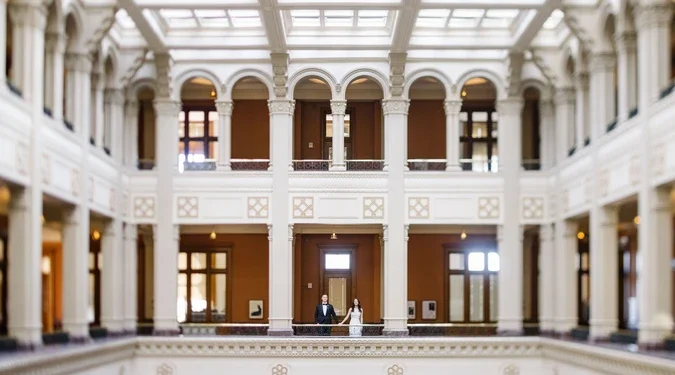 Rice Park offers open spaces for wide shots, while Landmark Center provides dramatic historic architecture for formal portraits.